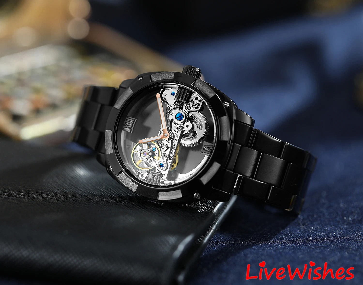 Эти наручные часы созданы для современного мужчины, который ценит стиль и премиум качество. Изысканный скелетон с оригинальным дизайном подчеркивает ваш деловой образ. Турбийон обеспечивает точность хода, а прозрачный корпус демонстрирует открытый механизм. Мужские механические часы это модное украшение мужской руки, необходимый аксессуар в вашем имидже. Ремешок из натуральной кожи черного цвета и нержавеющая сталь прозрачного черного корпуса добавляют солидности. Особо прочное стекло защищает от ударов. Водонепроницаемость 3 ATM дает возможность гулять под дождем без опасения. Оригинальная застежка бабочка обеспечивает комфортное надевание и плотной прилегание к мужскому запястью. Такой аксессуар придаст уверенности при встречах с деловым партнером, любые переговоры будут завершены успешно. Очень красивые мужские часы станут отличным подарком на Новый год, 23 февраля, День Святого Валентина или День Рождения. Порадуйте любимого мужчину, отца, друга или брата, такая вещь как данная модель мужских наручных часов - идеальный подарок папе или партнеру по бизнесу. Этот модный аксессуар также подойдет для друга, коллеги или мужа на День свадьбы или Юбилей. Наручные мужские часы скелетон с изысканным дизайном - необходимая деталь мужественного образа на деловых встречах или романтических свиданиях Упакованы в красивую подарочную коробку, эти часы станут идеальным подарком для успешного мужчины, следящим за своим имиджем, занимающегося спортом, ведущего здоровый и активный образ жизни