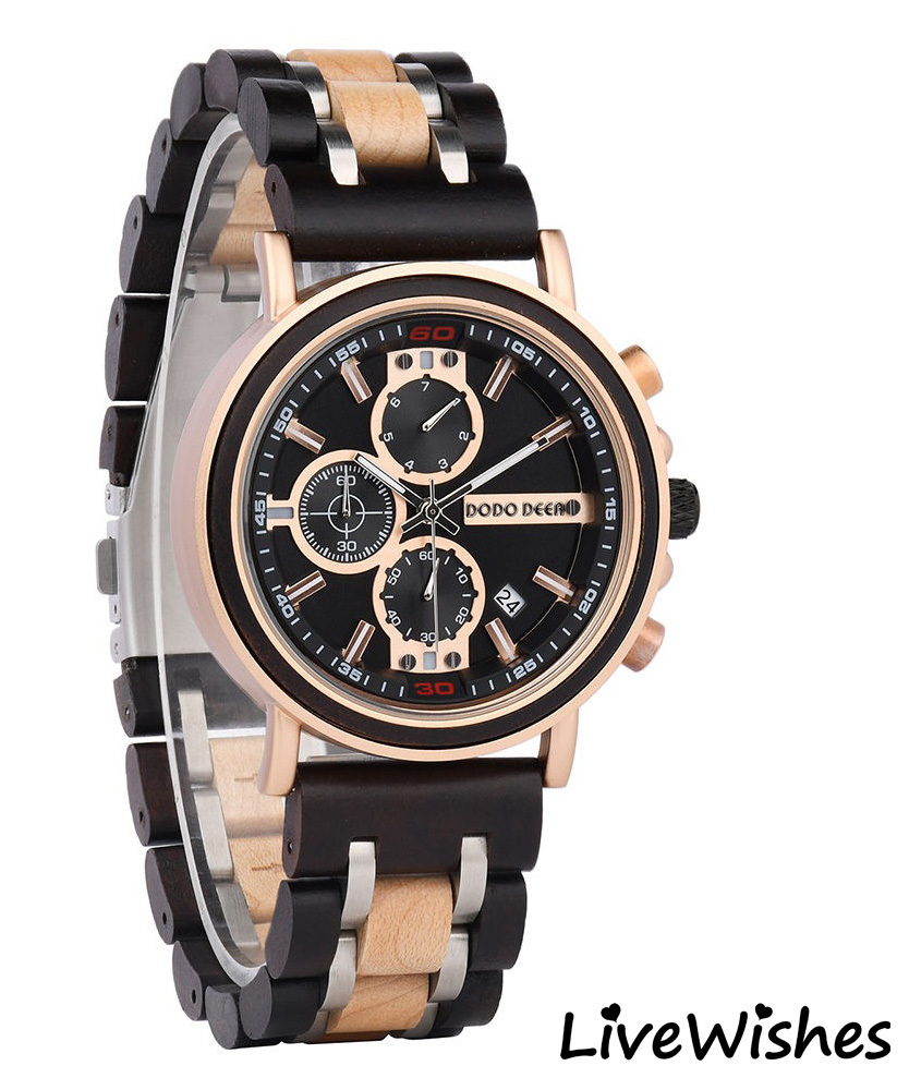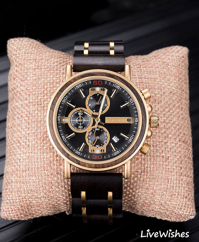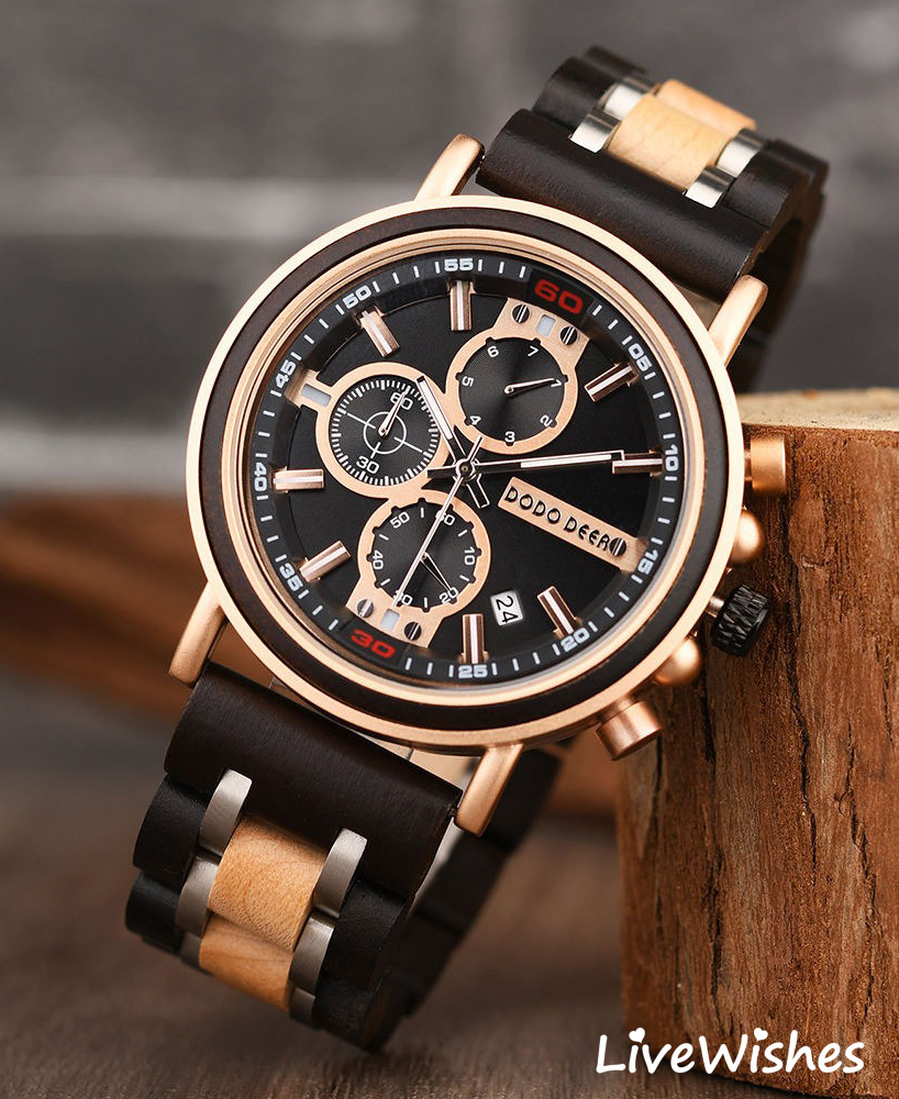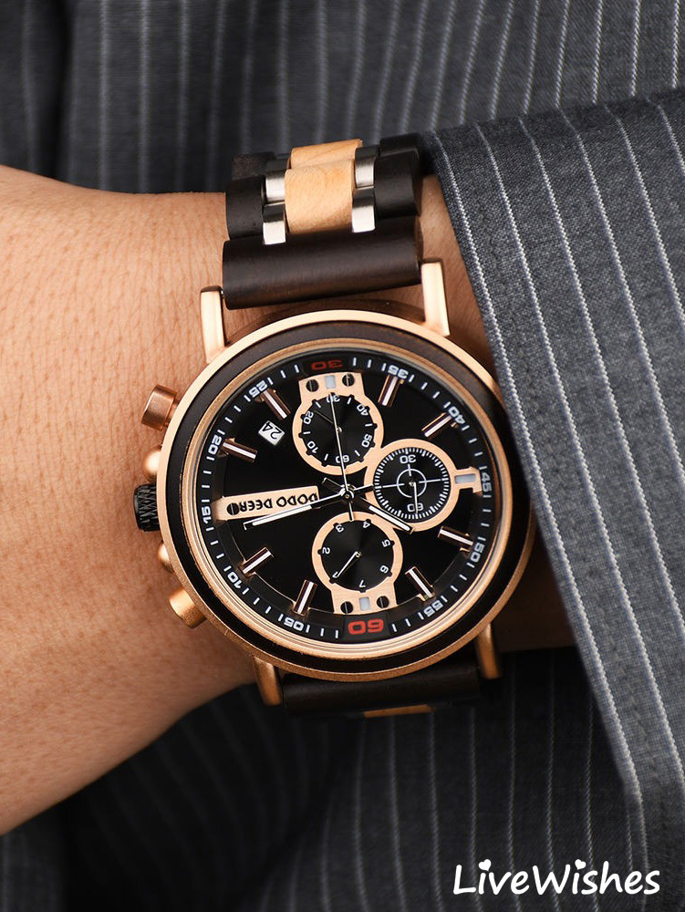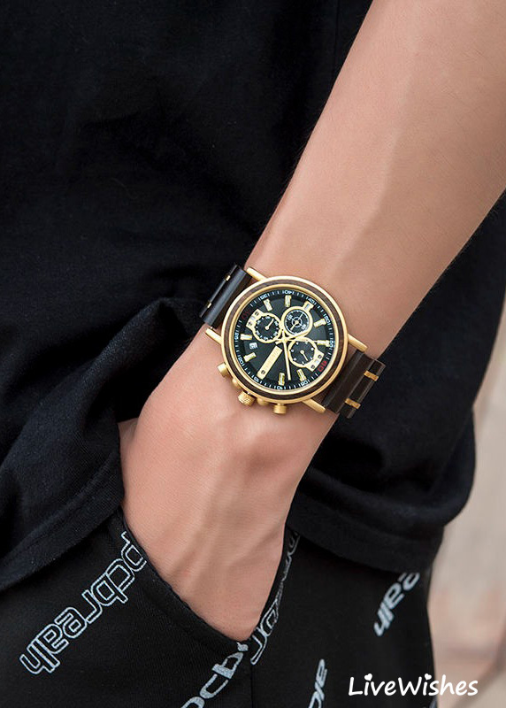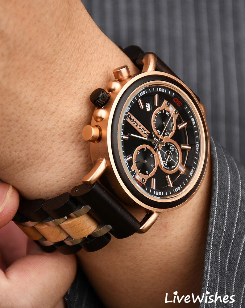 Кварцевые мужские наручные часы высокого качества - именно то, что нужно для создания наполненного стилем современного образа. Независимо от того, куда вы направляетесь - на деловую встречу, свидание или просто на прогулку - этот аксессуар станет отличным дополнением. Часы наручные изготовлены из натурального дерева зебра, что гарантирует их долговечность и надежность. Высокопрочное стекло устойчиво к царапинам, что позволяет сохранить их безупречный вид на протяжении многих лет. Деревянный ремешок обеспечивает комфортное прилегание к мужской руке и придает часам изысканный вид, подчеркивая ваш деловой образ и оригинальный вкус. Эти мужские часы в спортивном стиле оснащены хронографом и календарем, показывающим дату, что необходимо для современного успешного мужчины, вы никогда не пропустите важное событие. Хронограф поможет вам измерить затраченное время. Круглый циферблат на коричневом корпусе составляют лаконичный дизайн, что подчеркивает индивидуальность успешного мужчины. Механизм часов - кварцевый, что позволит вам не беспокоиться о стабильности хода. Водонепроницаемый корпус со степенью защиты 3АТМ позволяет гулять под дождем или мыть руки. Особая прочность - вот то, что отличает эти часы от других.