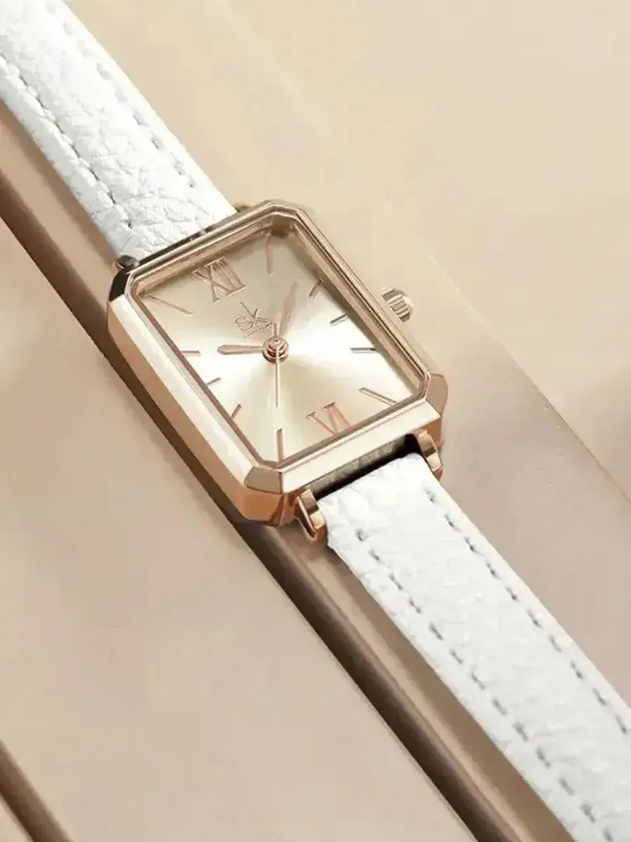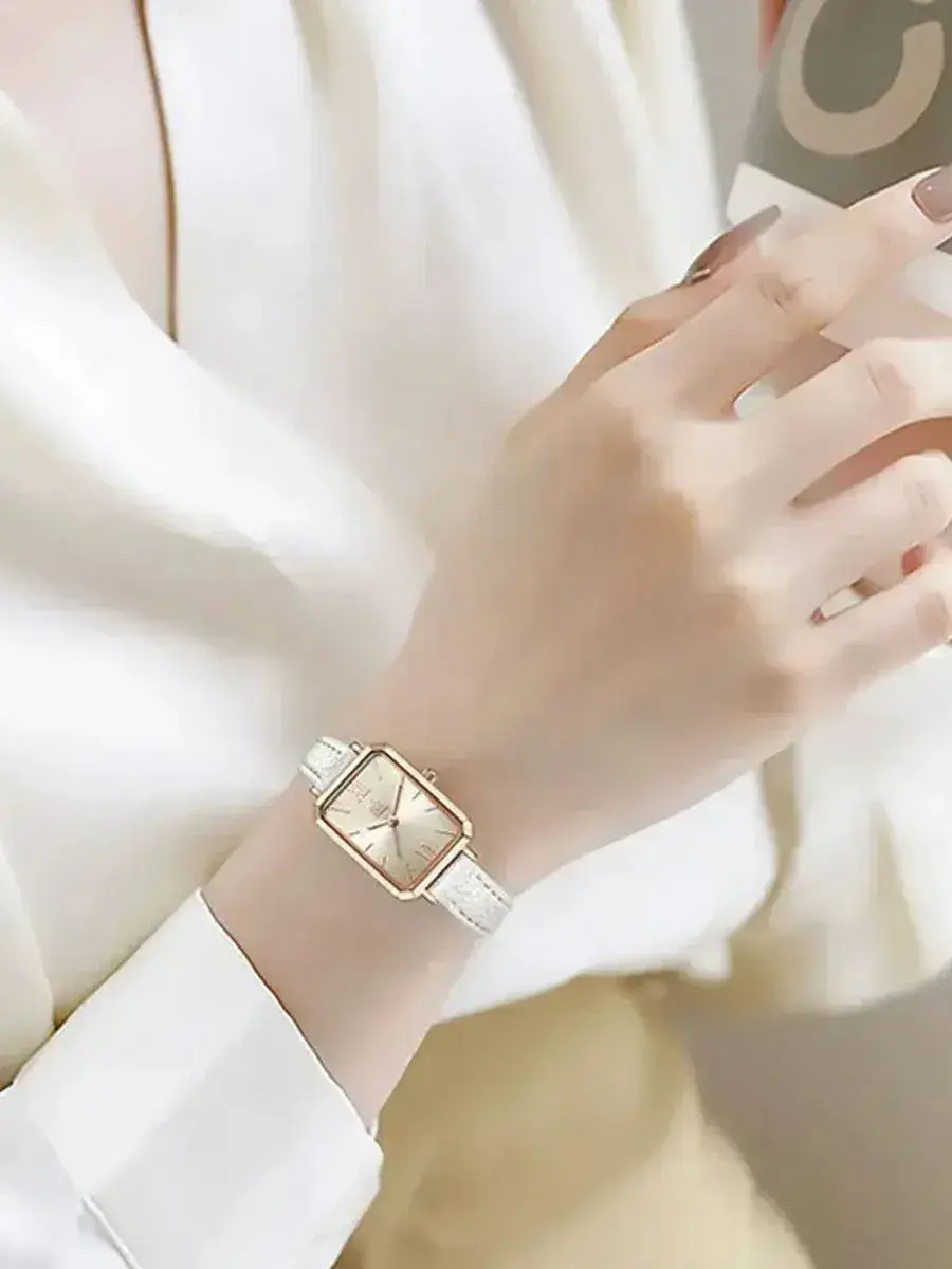 Часы женские наручные с прямоугольным золотистым циферблатом на тонком белом кожаном ремешке - красивый, модный и полезный аксессуар. Элегантные наручные женские часы подчеркнут ваш изысканный вкус и индивидуальный стиль. Часы смотрятся очень стильно, подойдут под любой гардероб - платье, брюки, джинсы, рубашку, блузку, деловой костюм. Лаконичный дизайн наручных часов в классическом стиле сделает ваш образ элегантным и привлекательным. Золотистый корпус из нержавеющей стали с перламутровым прямоугольным циферблатом на тонком ремешке делают часы изысканным украшением и подчеркивают тонкий вкус владелицы. Модель имеет кварцевый механизм, а это значит, что вам не придется их заводить. Водонепроницаемость на уровне 3 АТМ позволяет не беспокоиться о часах во время прогулок под дождем или при мытье рук. Модные классические кварцевые часы отличный вариант аксессуара для офиса, учебы, путешествий, вечеринок, деловых встреч. Наручные часы добавят очарования и уверенности современной элегантной обладательнице. Женские наручные часы прекрасно подходят для подарка, любимой девушке, молодой или взрослой женщине, маме, жене, супруге, подруге, сестре, коллеге, руководителю. Наши наручные часы понравятся любительницам активного и здорового образа жизни, ухоженным красавицам с безупречным вкусом, а также деловым женщинам, ценящим стиль. Прекрасный подарок на Новый год, 8 марта, День влюбленных, День рождения, годовщину знакомства, для романтического свидания, День учителя, профессиональный праздник или любое значимое событие. Огромный плюс – упаковка в подарочную коробку и наличие запасной батарейки. Женские наручные часы данной модели прекрасно подходят для запястья до 17 см Элегантные женские наручные часы с прямоугольным циферблатом - изысканный аксессуар, который станет прекрасной деталью любого наряда. Эти часы сочетают в себе женственность, элегантность и безупречный вкус, делая их идеальным выбором для тех, кто ценит стиль и качество.