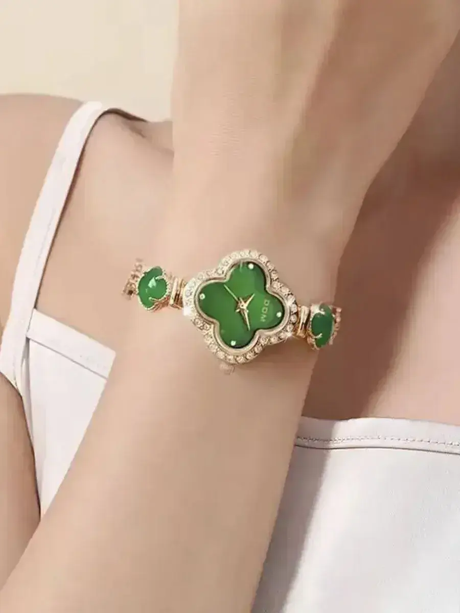 Женские часы наручные кварцевые — это изысканное украшение, которое превращает каждый взгляд в восторг. Их корпус в форме клевера, окруженного стразами, буквально сияет роскошью и блеском. И именно этот гламурный аксессуар является необходимым украшением истинной женщины в любой ситуации, будь то романтическое свидание, офисные будни или семейное торжество. Браслет с камнями зеленого цвета и с креплениями из страз подчеркнет вашу индивидуальность и неповторимое обаяние.
