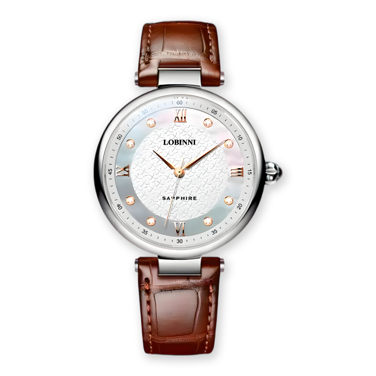 Механические женские наручные часы высочайшего качества - именно то, что нужно для создания наполненного стилем и элегантностью образа. Часы наручные изготовлены из прочной нержавеющей стали, что гарантирует их долговечность. Стекло из высококачественного сапфира устойчиво к царапинам и ударам, что позволяет сохранить их безупречный вид на протяжении многих лет. Ремешок из натуральной кожи коричневого цвета придает часам изысканный и стильный вид, подчеркивая ваш деловой образ. Серебристый циферблат с перламутром окруженный золотистым безелем подчеркивает индивидуальность и придает изысканности успешной женщине. Водонепроницаемый корпус со степенью защиты 5АТМ позволяет использовать часы даже в условиях повышенной влажности. Необходимое украшение женской руки, эти часы подойдут как молодым девушкам, так и взрослым женщинам, спортсменкам и бизнес-леди, руководителям, административным работникам - женское запястье, которое украшают такие наручные часы гарантировано не останется незамеченным. Эти оригинальные классические стильные часы станут шикарным, дорогим подарком на любой праздник - Новый год, 8 марта, День учителя, День рождения, юбилей, День свадьбы, годовщину совместной жизни, День влюбленных или профессиональный праздник - абсолютно любое значимое событие. Они идеально подойдут для прогулок, романтических свиданий, путешествий или деловых встреч. Наручные часы всегда желанный подарок для отца, мужа, сына, брата, друга, коллеги, руководителя или партнера по бизнесу. Приобретите эти премиум часы уже сегодня и ощутите всю их элегантность и роскошь.
