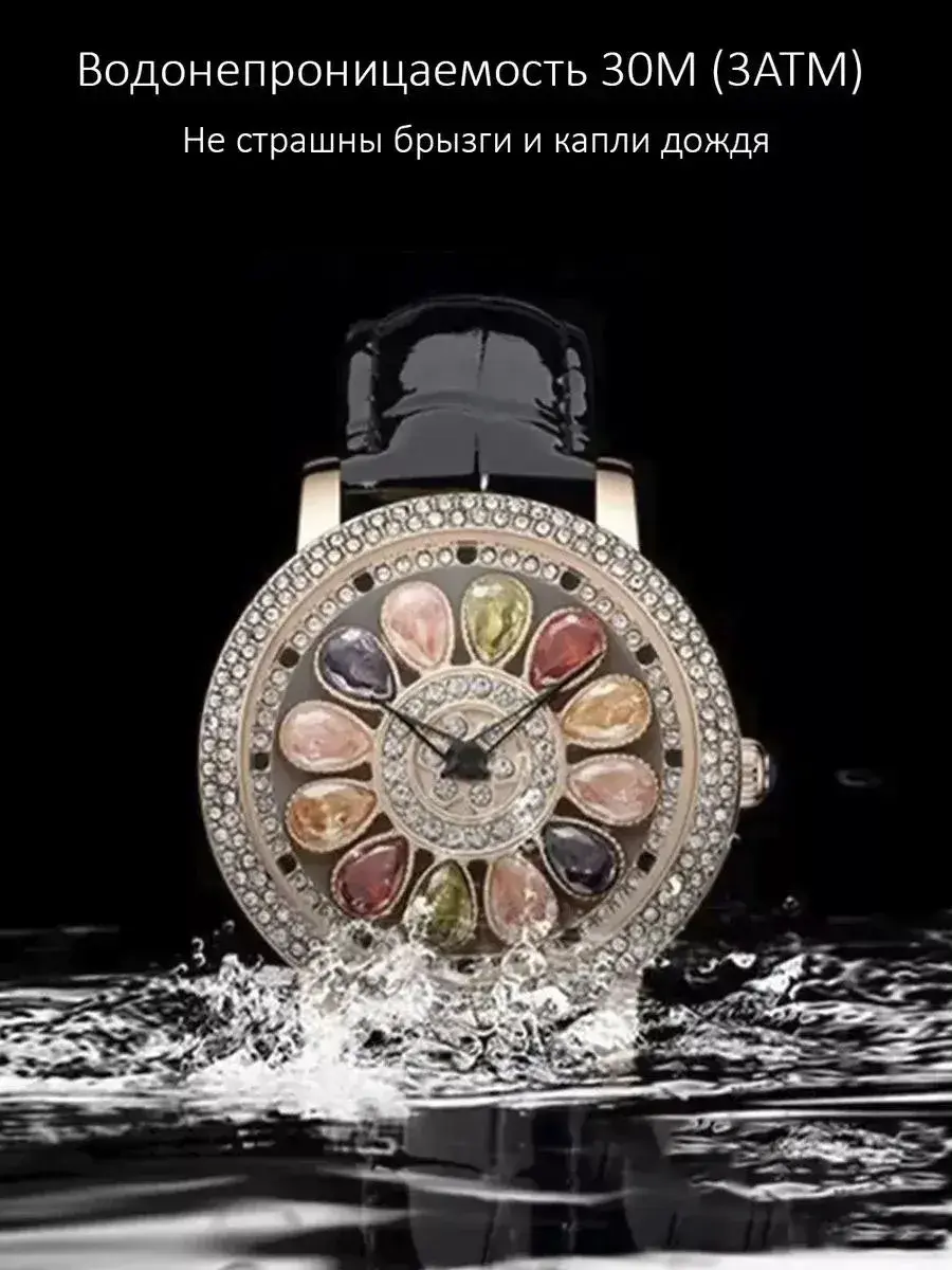 Женские часы наручные кварцевые — это изысканное украшение, которое превращает каждый взгляд в восторг. Вращающиеся яркие камни циферблата окруженного стразами превращают часы в уникальный женский аксессуар, который буквально сияет роскошью и блеском, притягивающими внимание и вызывающими удивление. Черный лаковый ремешок из кожи подчеркивает ваш утонченный вкус и романтический стиль. Кварцевый механизм, скрытый в нержавеющей стали, гарантирует точность и надежность. Водонепроницаемость 3 АТМ добавляет уверенности — теперь ни дождь, ни случайные брызги не омрачат вашего настроения. Вам не нужно заводить или заряжать этот модный полезный аксессуар — он всегда готов к действию. Эти изящно сияющие часы легко добавят стиль в любой вечерний наряд или повседневный образ. Подчеркните красоту своей женской руки на коктейльной вечеринке или корпоративном событии. Кварцевые наручные женские часы с вращающимся циферблатом - модное и функциональное украшение для женщины. Часы наручные незаменимый полезный аксессуар для женщин, которые следят за безупречным стилем. Этот блестящий удивительный аксессуар подойдет как для повседневного использования, так и для особых событий, изысканная деталь наряда на праздничном мероприятии или на бизнес встрече. Удобная застежка делает это украшение очень приятным и простым в использовании. Черный кожаный лаковый браслет часов плотно облегает запястье и обеспечивает комфорт при ношении, к тому же роскошно украшает женское запястье владелицы. Уникальный подарочный вариант для любимой подруги, девушки, супруги, мамы, сестры или коллеги на любое торжество! Прекрасный подарок на Новый год, 8 марта, День влюбленных, День рождения, годовщину знакомства, для сюрприза на романтическом свидании, День учителя, профессиональный праздник или любое значимое событие. Часы упакованы в красивую подарочную коробочку, в комплект входят запасная батарейка и салфеточка для ухода за циферблатом.