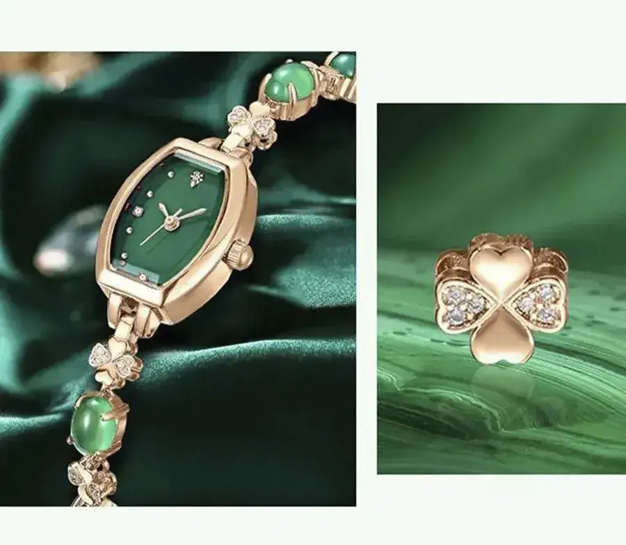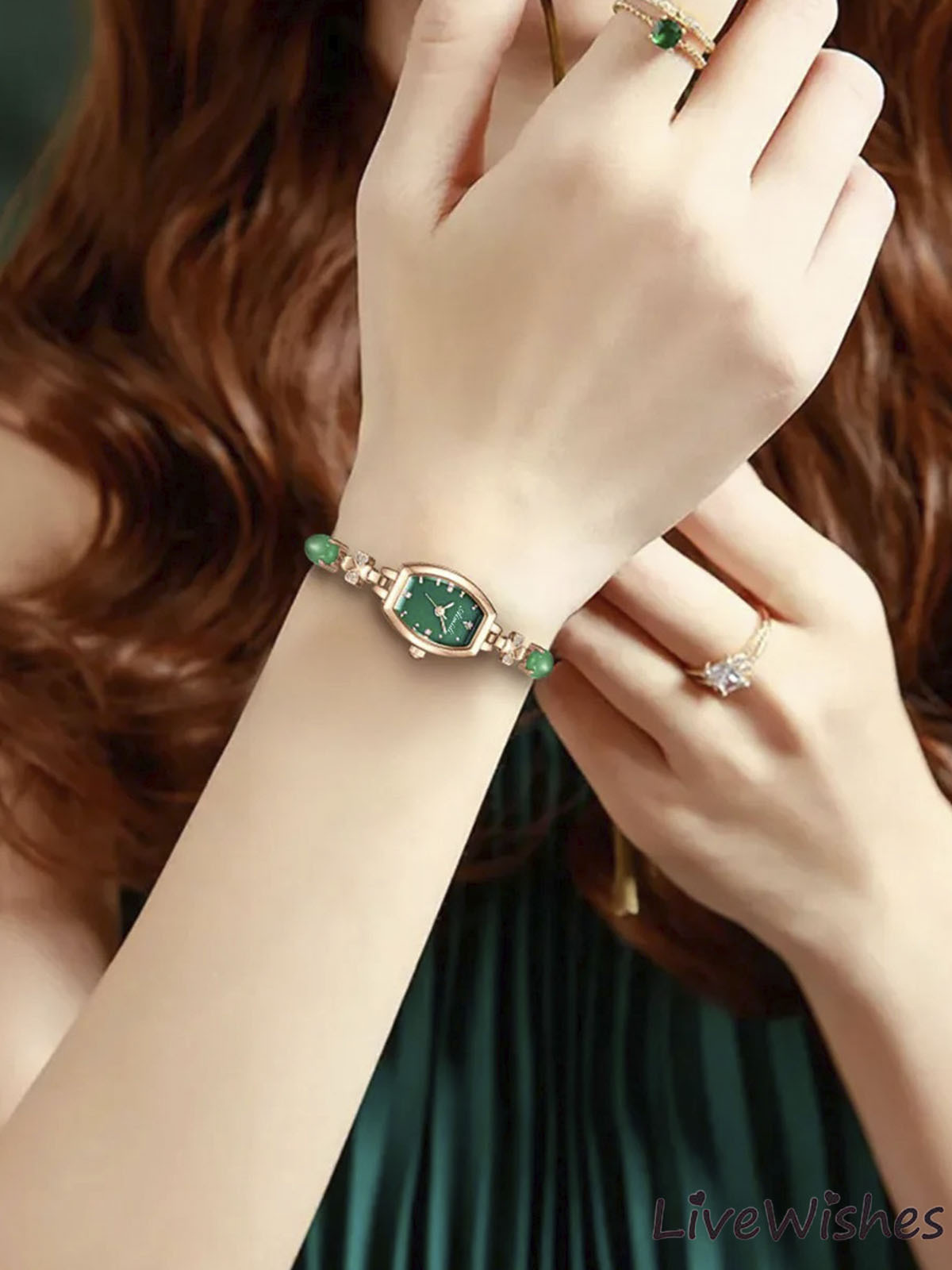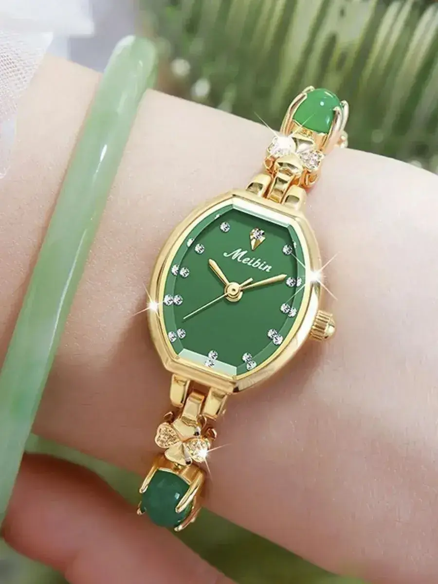 Оригинальный зеленый циферблат изысканной формы в золотистом корпусе окруженном на браслете из натурального минерала халцедона - вот наручные женские часы, которые любой наряд сделают праздничным и заметным! Каждый камень тщательно подобран и крепко закреплен, чтобы ничто не могло испортить его блеск. Удобная застежка обеспечивает комфортное прилегание к запястью, а легко снимающиеся звенья помогут отрегулировать длину браслета для подходящего размера. Благодаря водонепроницаемости 3ATM эти часы можно носить даже во время дождя или при мытье рук, часам не страшны капли воды. Часы - браслет из натуральных камней камнями шикарная деталь и летнего гардероба, и для особых случаев, таких как банкет, свадьба, семейное торжество, корпоративная вечеринка, романтический ужин с любимым человеком! Это настоящее изысканное украшение, которое привлекает внимание и делает образ более завершенным и незабываемым.