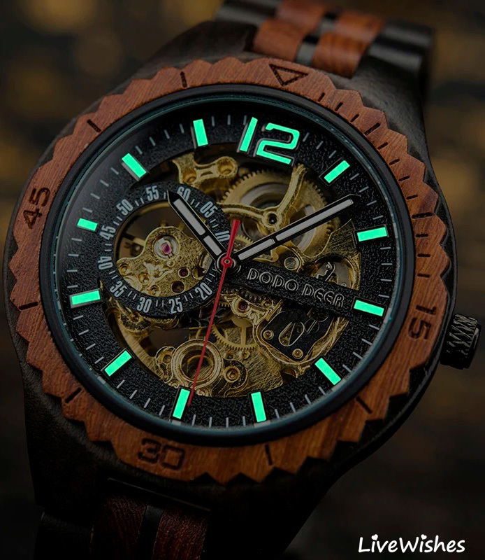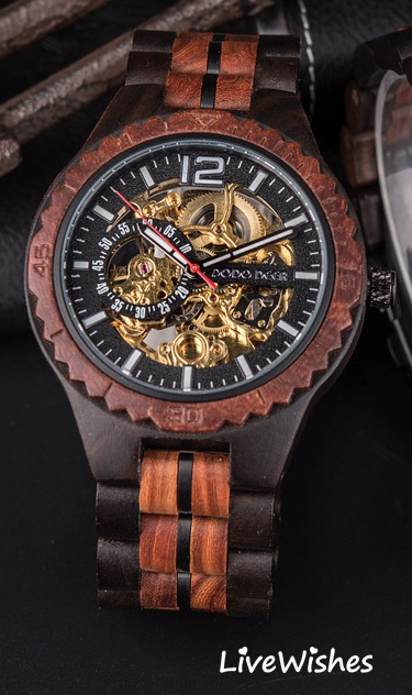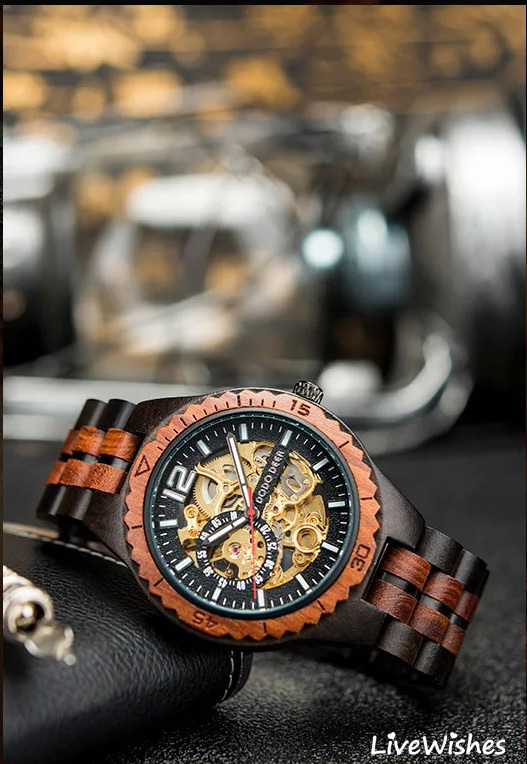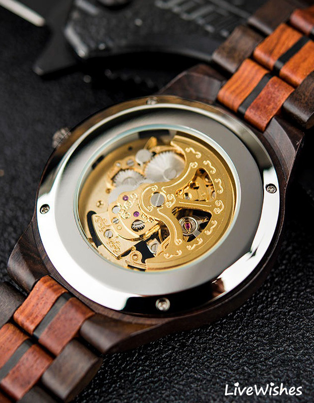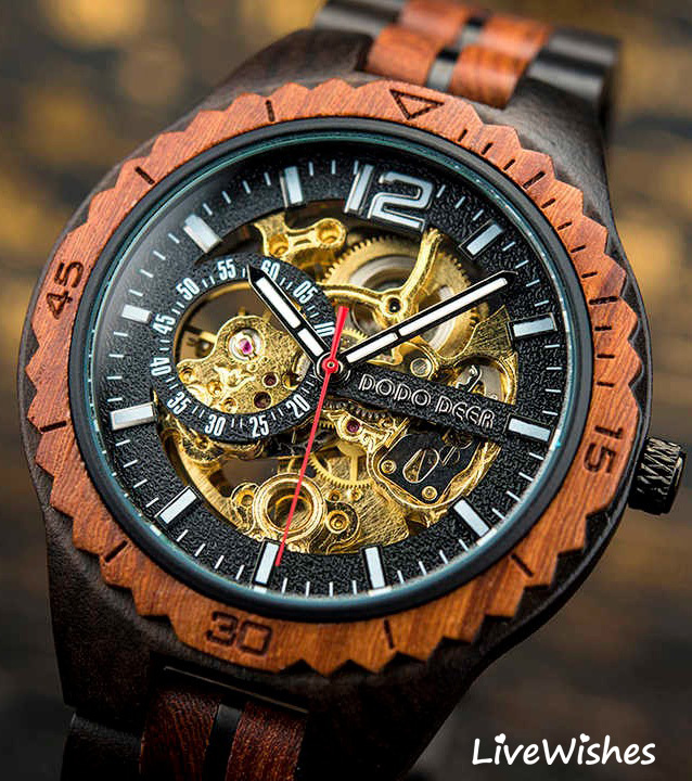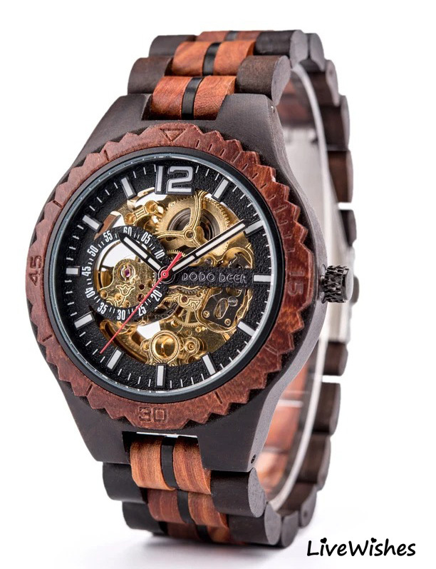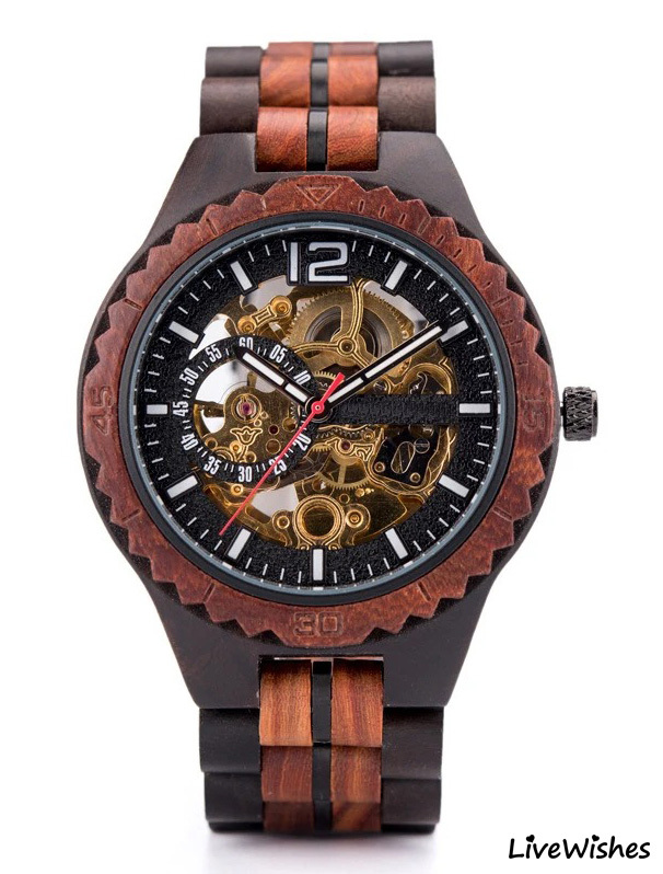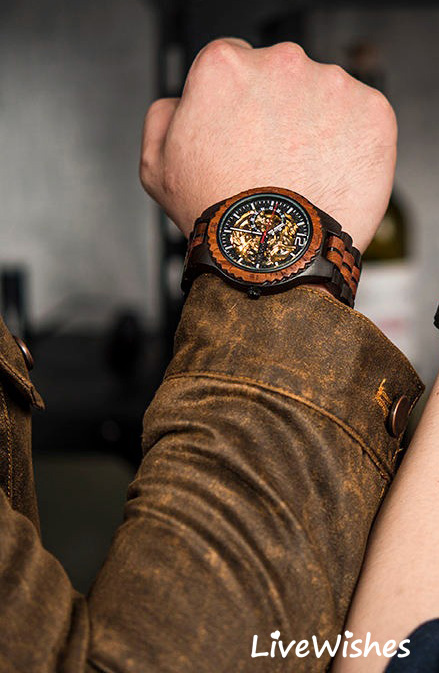 Эти механические наручные часы созданы для современного мужчины, который ценит стиль и премиум качество. Изысканный деревянный скелетон с оригинальным дизайном подчеркивает ваш деловой образ. Балансир обеспечивает точность хода, а прозрачный корпус демонстрирует открытый механизм. Мужские механические часы из натурального дерева это модное украшение мужской руки, необходимый аксессуар в вашем имидже. Изысканные модные деревянные мужские часы - скелетон подчеркнут вашу индивидуальность и имидж современного успешного мужчины. Особо прочное стекло защищает от ударов. Водонепроницаемость 3ATM дает возможность гулять под дождем без опасения. Оригинальная застежка пряжка обеспечивает комфортное надевание и плотной прилегание к мужскому запястью. Такой аксессуар придаст уверенности при встречах с деловым партнером, любые переговоры будут завершены успешно. Очень красивые мужские часы станут отличным подарком на Новый год, 23 февраля, День Святого Валентина или День Рождения. Порадуйте любимого мужчину, отца, друга или брата, такая вещь как данная модель мужских наручных часов - идеальный подарок папе или партнеру по бизнесу. Этот модный аксессуар также подойдет для друга, коллеги или мужа на День свадьбы или Юбилей. Наручные мужские часы скелетон с изысканным дизайном - необходимая деталь мужественного образа на деловых встречах или романтических свиданиях. Упакованы в красивую подарочную коробку, эти часы станут идеальным подарком для успешного мужчины, следящим за своим имиджем, занимающегося спортом, ведущего здоровый и активный образ жизни