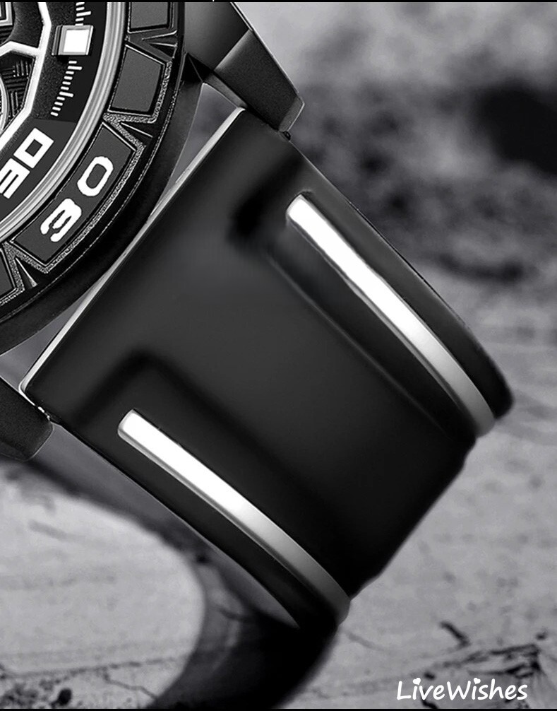 Особенные мужские наручные часы воплощают трэнд изысканного стиля и создают оригинальный дизайн мужского образа. Эти необычные мужские часы скелетон в спортивном стиле - модное украшение мужской руки. Корпус черного цвета выполнен из нержавеющей стали, обеспечивая долговечность и привлекательный внешний вид. Креативный дизайн мужских наручных часов сделает вас центром внимания в любой компании. Циферблат с перфорацией, напоминающей автомобильное колесо открывает работу кварцевого механизма, что делает часы необыкновенной деталью брутального мужского образа. Такое решение дизайнера делает загадочным этот аксессуар, мужская рука непрестанно ловит любопытные взгляды коллег или друзей. Светящийся циферблат позволяет определять время в ночное время суток или в темном помещении. Эти часы созданы для настоящих мужчин, будь то деловой молодой человек, студент или взрослый спортсмен, для которого важны стиль и внимание. Черный с белыми вставками силиконовый ремешок дружелюбно обхватывает запястье, а водонепроницаемость 3 АТМ позволяет гулять под дождем без опаски. К тому же кварцевый механизм обеспечивают точность хода без необходимости заводить, делая часы необходимым аксессуаром для современного мужчины. Эти стильные наручные часы упакованы в элегантную подарочную коробку, готовы стать идеальным презентом на любой праздник - Новый год, Рождество, День Святого Валентина, 23 февраля, профессиональный праздник или значимое событие День рождения, День свадьбы, окончание учебы, спортивная победа или романтическое свидание. Изысканный выбор для мужа, брата, друга, коллеги, партнера по бизнесу или любимого мужчины. Часы на руку прослужат долго за счет прочности материалов. Такие мужские аксессуары обязательно пригодятся для завершения образа.